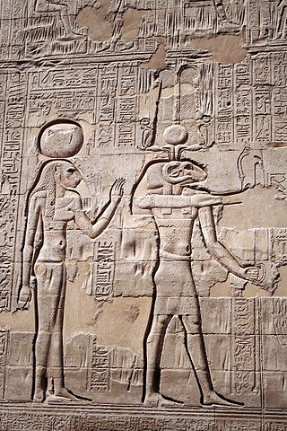 The creator god Khnum has two snakes above his head, which correspond to the cosmic fluids Jin and Jang, on images next to the sun disk (Re) and the two plates above his head.