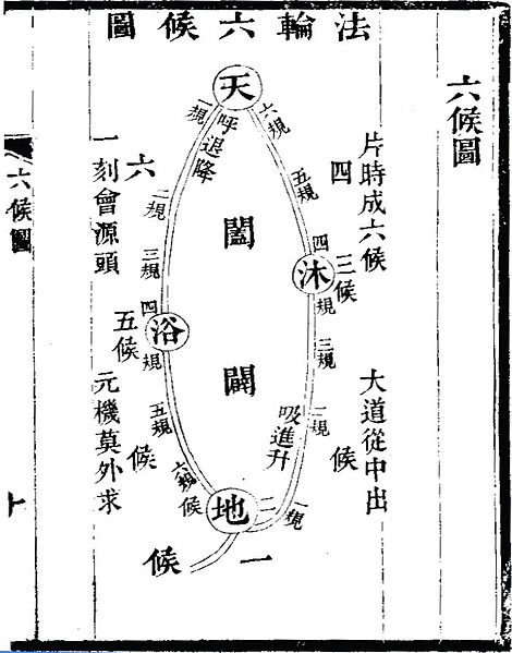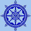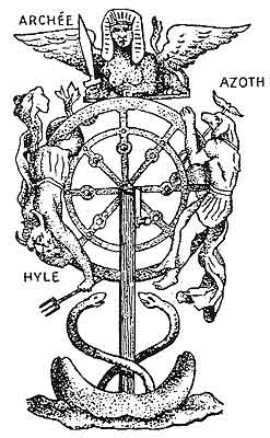 Step 10 : The Wheel (of Dhamma) Two crescents swimming on a sea. A red snake and a green snake come out of the crescents. The crescents are the fundament of a long rod, at the top of which a wheel is attached. The whell is inhabited by a deity and a demon. The sea is the quieted sea of "Samsara" Hinduism has a Garbhodaka Ocean and the milkocean, the spinning of which is here symbolized(-> Kurma-Avatar). The two sphinxes of card 7 have developed and united, and the frontside has the color of the one spinx while the backpart has the color of the other sphinx of card 8. The sphinx above the wheels holds a sword and has two wings. The chela has now developed the inner cycle of energies and controls them. |